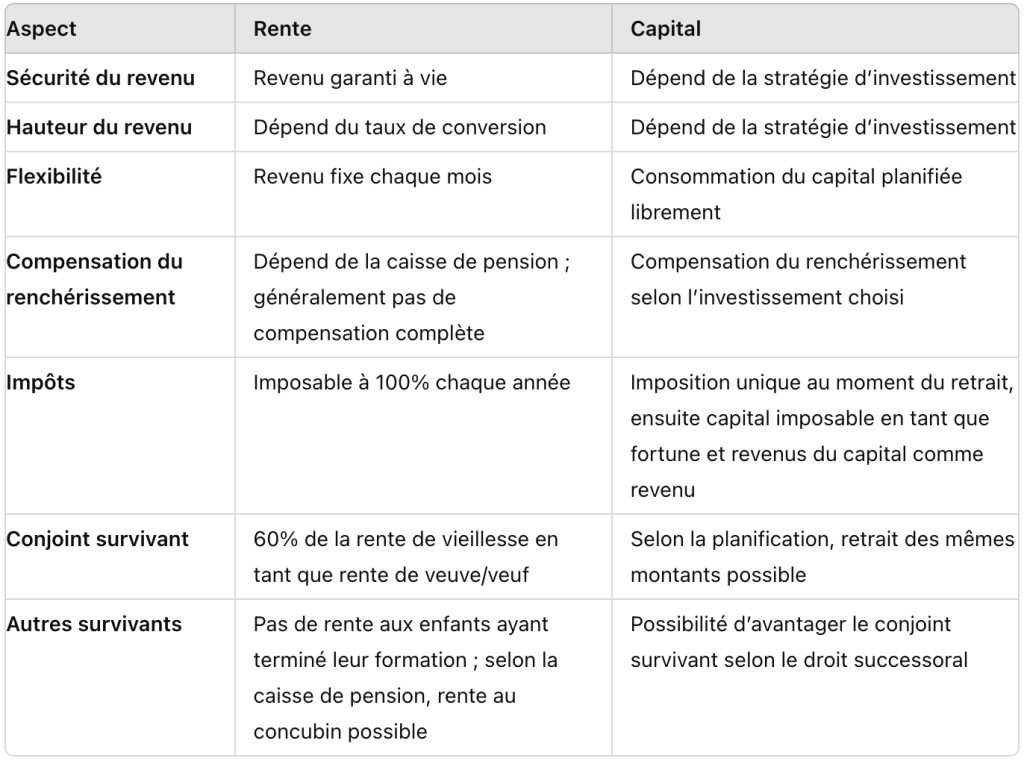 Lorsque vous approchez de l’âge de la retraite, vous êtes confronté à une décision cruciale concernant votre avoir du 2ème pilier : choisir entre percevoir une rente ou retirer le capital. Chacune de ces options a ses propres avantages et inconvénients, et il est essentiel de bien comprendre ces différences pour faire le choix le plus adapté à votre situation. Voici huit conseils pour vous aider à prendre une décision éclairée. ⤵️